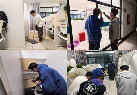 活动期间,项目组织人员对志愿活动任务进行细致分工,将成员划分为地面清扫组、玻璃擦拭组、台面整理组、绿植养护组及环境排查组,明确各小组职责与工作标准,确保活动高效有序推进。各组成员各司其职、干劲十足,完成了自习室地面清扫拖拭、玻璃门擦拭、自习室桌面整理、桌椅摆放等工作。经过近一小时的辛勤劳动,天佑斋T083030自习室面貌焕然一新,地面整洁、桌面有序、窗明几净,整体学习环境得到显著优化。