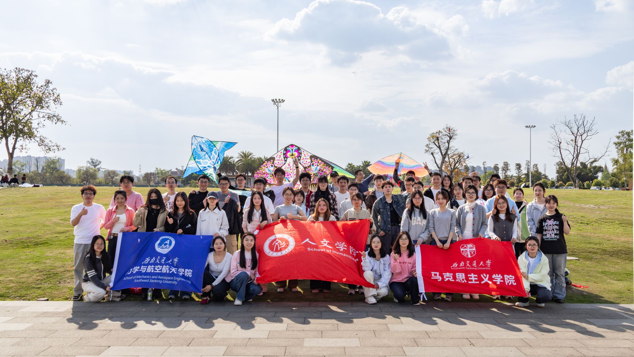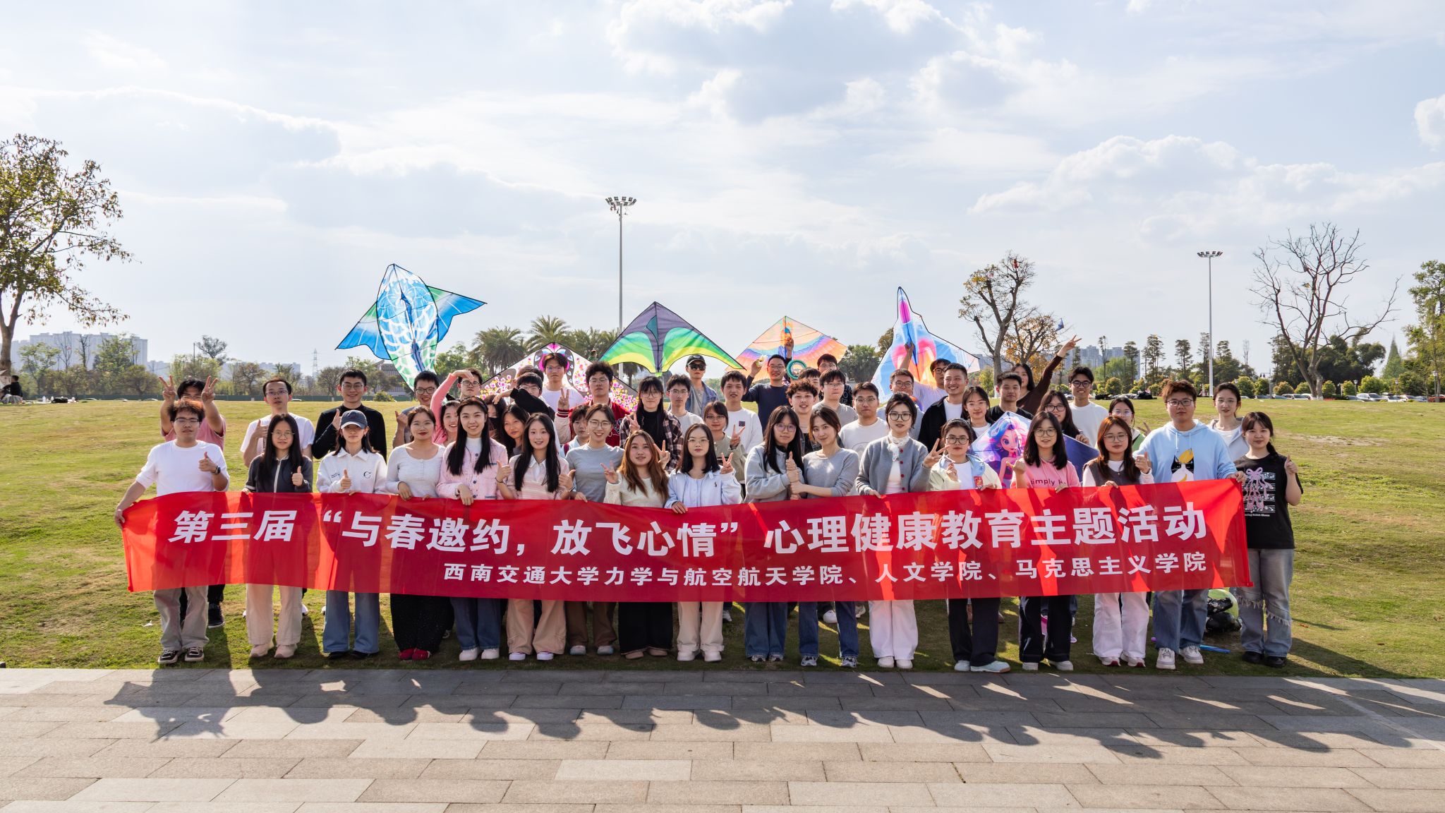本次活动以“与春邀约,放飞心情”为主题,旨在通过团体互动,帮助同学们缓解学业压力、调适心理状态,在自然中释放情绪、在协作中拉近距离。活动当日天气晴好,参与同学在春日暖阳中结伴而行,在蜀绣公园草坪上共同放飞亲手绘制的风筝。