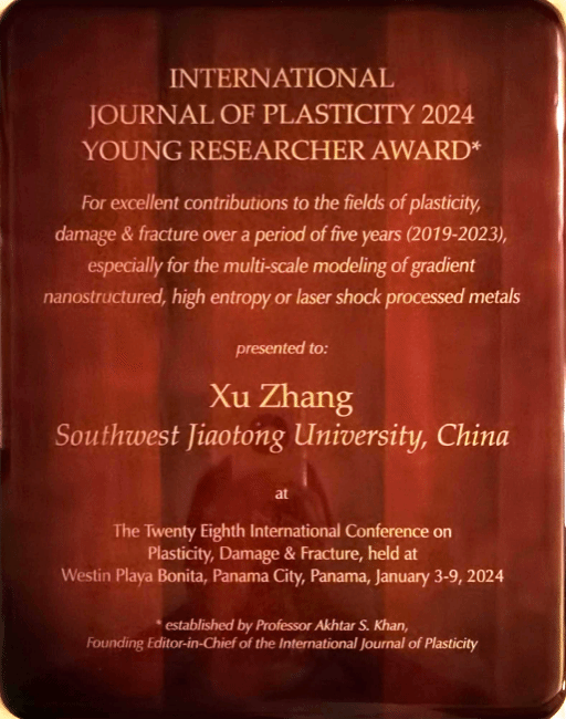 第28届塑性、损伤、断裂国际学术大会于2024年1月3日-9日在巴拿马召开,会议颁发了Khan International Award(Khan国际奖)和International Journal of Plasticity Young Researcher Award(IJP青年学术奖)两个奖项。西南交大葡京集团娱乐网址394张旭教授因在梯度结构材料、高熵合金和激光冲击强化材料的多尺度模拟相关领域的杰出贡献(multi-scale modeling of gradient nanostructured, high entropy or laser shock processed metals)获第19届IJP青年学术奖。