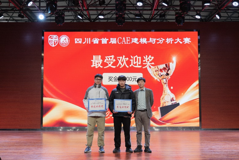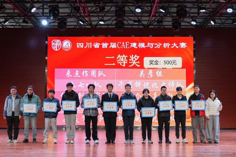 典礼伊始,刘虎副院长为大会致开幕词,肯定了赛事在培育工业软件人才、促进校企产学研协同方面的重要意义;四川省工业软件学会会长李斌则从行业发展角度,强调了CAE技术对工业创新的核心支撑作用与重要性。随后,与会领导嘉宾依次为获奖队伍颁奖,根据复试答辩成绩,大赛按比例评选出特等奖、一等奖、二等奖、三等奖队伍,同时依据线上投票结果颁发最受关注奖。