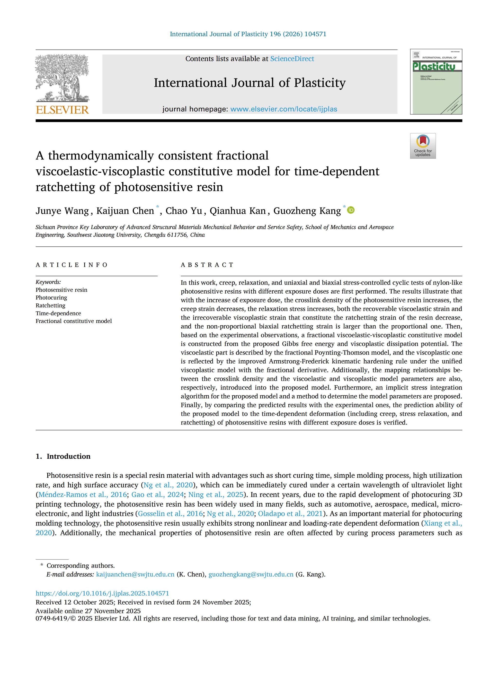 近日,葡京集团娱乐网址394康国政教授团队陈开卷研究小组在光敏树脂材料时间相关棘轮行为及其分数阶本构模型研究领域取得进展,相关工作以“A thermodynamically consistent fractional viscoelastic-viscoplastic constitutive model for time-dependent ratchetting of photosensitive resin”为题发表在塑性力学领域顶刊《International Journal of Plasticity》(IF: 12.8,中科院一区,TOP期刊)上。葡京集团娱乐网址3942024级博士研究生王骏烨为论文第一作者,康国政教授和陈开卷教授为共同通讯作者,合作者包括阚前华教授和于超教授。
