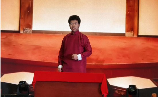 第二篇章在传统文化的厚重回响中展开。周诚毅同学一身长衫,献上传统贯口《八扇屏·莽撞人》,字句铿锵,气韵贯通,生动再现历史人物的豪迈气概,展现了中华语言艺术的独特魅力。