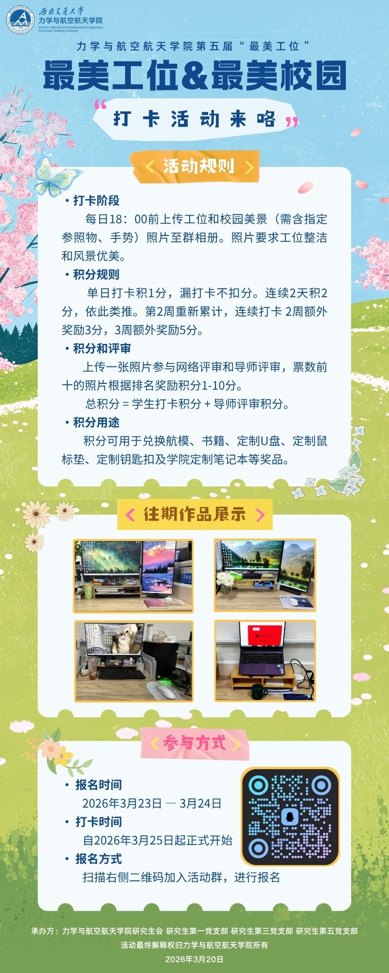 长期以来,学院为贯彻落实“立德树人”教学育人的根本任务,不仅始终坚持“全程育人、全方位育人,全员育人”的三全育人理念,同时将学校“严谨治学、严格要求”的双严精神深入到线上与线下的教学全过程中。研究生工作室作为广大研究生学术交流和科研生活的主要场所,以环境营造为依托促进治学研学氛围,是此次活动的出发点。此外,除去繁忙的学术研究外,同学们也应该养成劳逸结合的习惯,正值春暖花开,活动新增最美校园风景打卡环节,邀请各位同学走出工位,共赏校园美景。