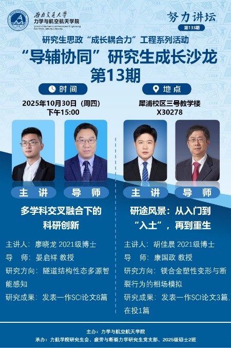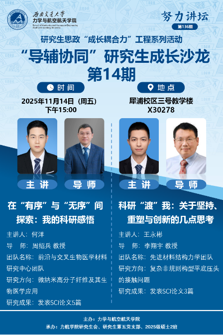 学院组织开展“导辅协同”研究生成长沙龙、研究生新生引导课、“努力讲坛”讲座等形式,充分利用好科研组会、班会、支部会等多种渠道,结合优秀朋辈案例,围绕职业生涯规划、学术科研发展等内容,启迪新生潜心科研、担当作为。