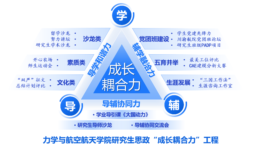 学院在三全育人理念的指导下,完善导师与研究生“导学和谐”、辅导员与研究生“辅学融洽”的模式,有机联结导师与辅导员“导辅协同”力量,构建学术创新与思政育人共融共促的育人体系。