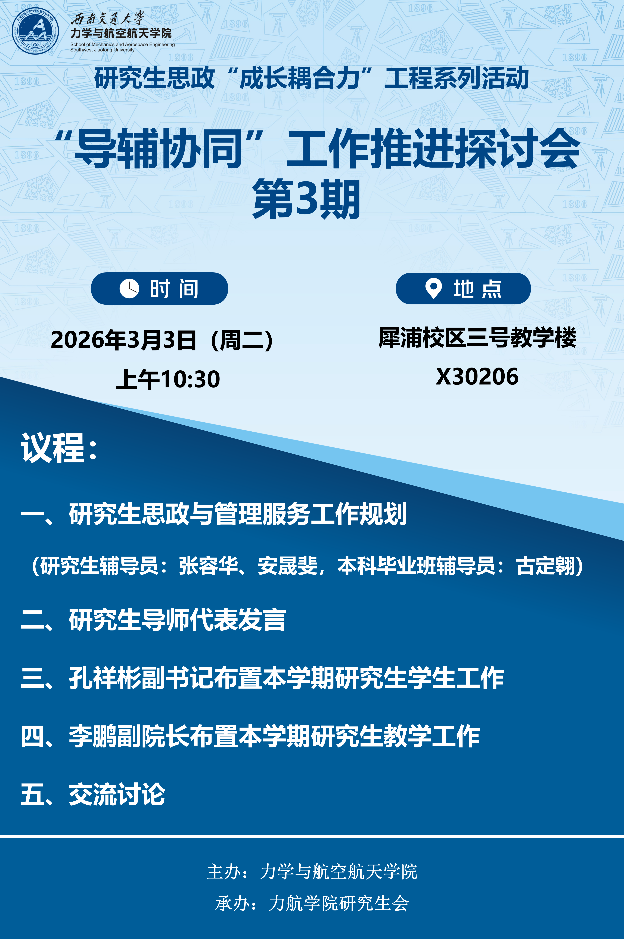 为增强导辅协同工作体系建设,促进导师和辅导员间的高效沟通,凝聚育人合力,2026年3月3日上午,葡京集团娱乐网址394研究生思政“成长耦合力”工程系列活动之“导辅协同”工作推进探讨会第三期在犀浦校区X30206举行。学院党委副书记孔祥彬,副院长李鹏,导师代表王宇星,研究生辅导员张容华、安晟斐,本科毕业班辅导员古定翱参加会议。